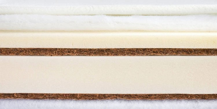 - wypełnienie materaca stanowią pianka memory/termoelastyczna (2 cm), dwie maty kokosowe (2×1 cm) otulone włókniną puszystą, rozdzielone pianką poliuretanową (6 cm)
