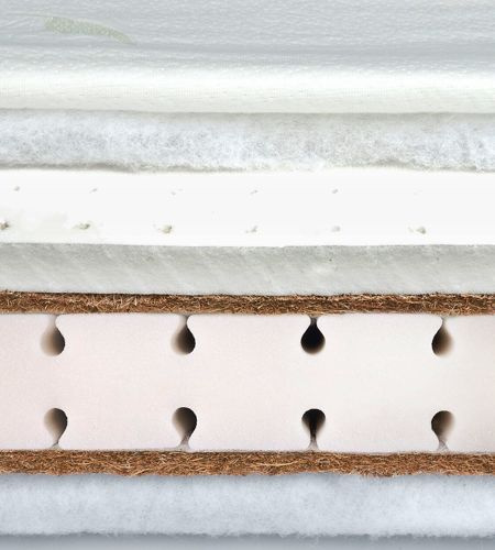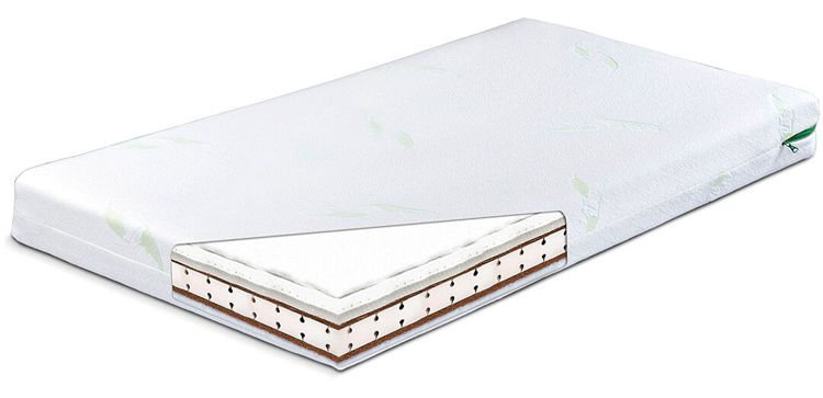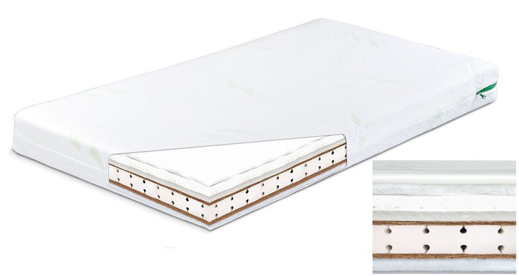 - wypełnienie materaca stanowią perforowana warstwa lateksowa (2 cm),dwie maty kokosowe (2×1 cm) otulone włókniną puszystą, rozdzielone karbowaną pianką poliuretanową (6 cm)