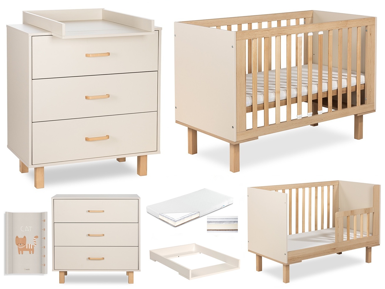 Zestaw mebli dziecięcych z Łóżeczkiem z Materacem z Przewijakiem Szampan Buk LAURA